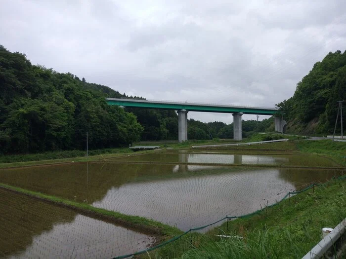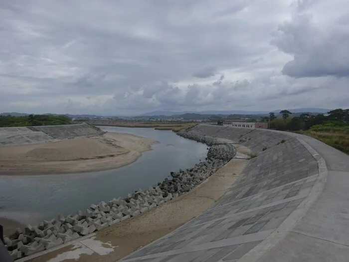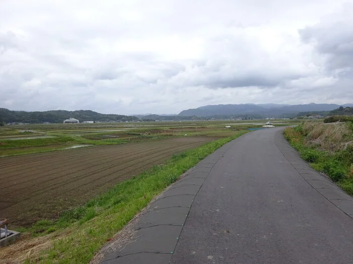 La piste y est toutefois interrompue brusquement par le pont Higashimaiko ( 東舞子橋 ) , qui surplombe l’embouchure de la rivière Niida ( 仁井田川河口 ). De l’autre côté, une piste cyclable dont l’aménagement semble encore inachevé, sur une digue de béton vraisemblablement mise en place après 2011, épouse le lit de la rivière vers l’ouest, donc vers l’intérieur, les collines et les montagnes.