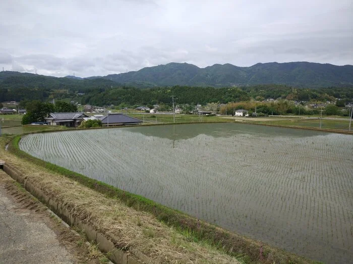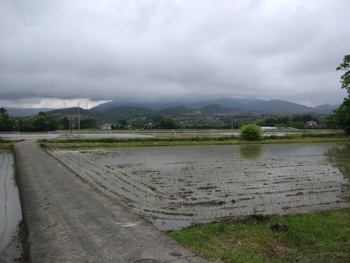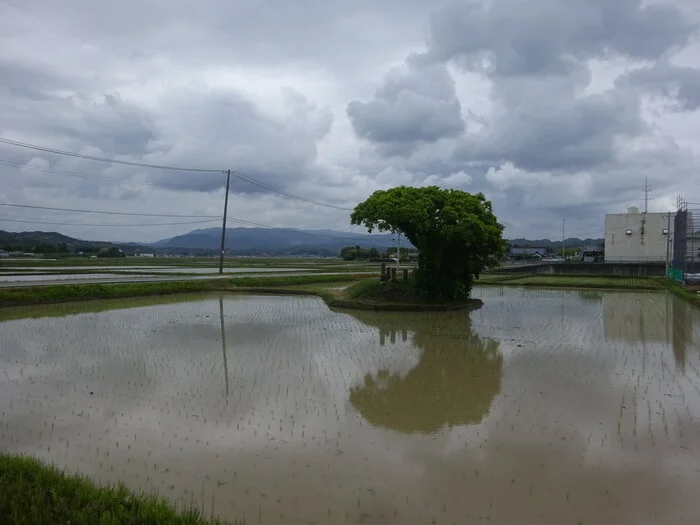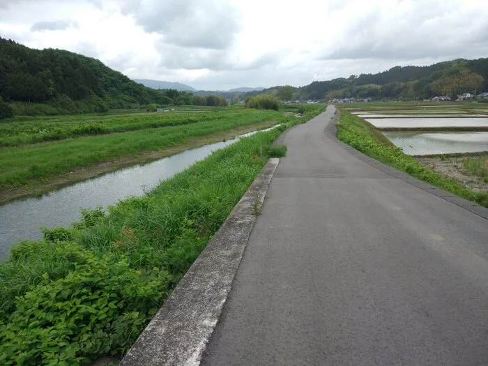 La petite descente qui suit nous mène à Umenosaku (梅ノ作, 25 m d’altitude), puis nous pénétrons dans Ogawa-esuji (小川江筋). Les nuages, de plus en plus lourds et bas, se font menaçants…
