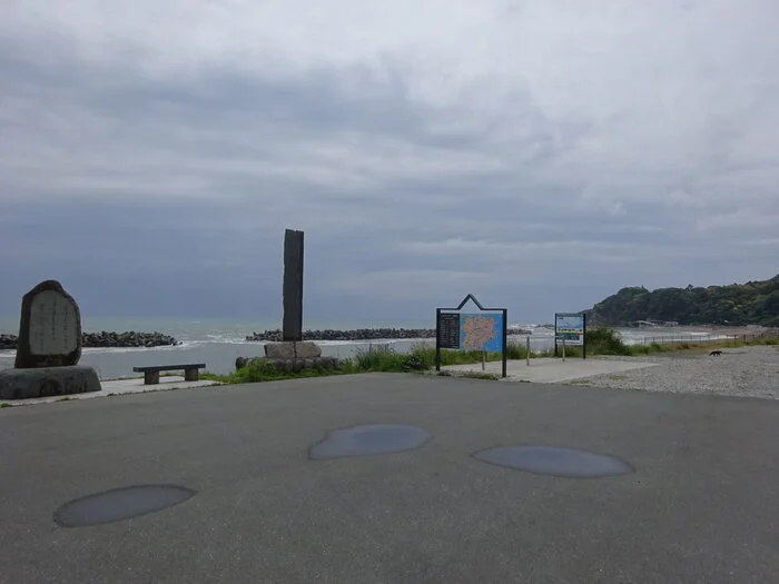 Environ deux kilomètres plus loin, nous passons devant le belvédère de la plage Hattachi ( 波立海岸展望台 ), et ses deux monuments de pierre.