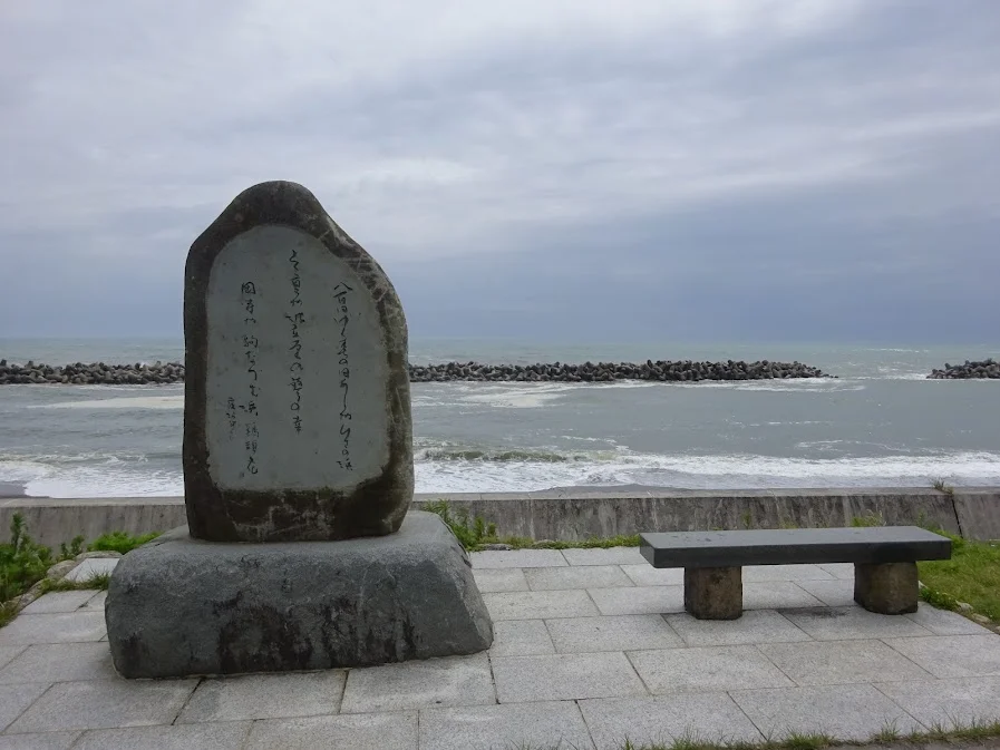 Le premier, à droite, est consacré au moine bouddhiste et poète Saigyō (西行, 1118-1190), et celui de gauche à un poète de la période Edo, Naitō Yoshihide (内藤 義英, 1655-1733). Sur ce dernier étaient gravés trois de ses haïkus célébrant respectivement le printemps, l’été et l’automne, chaque saison étant associée à un des symboles de la région : la plage de Hisanohama pour le printemps, le Hattachidō pour l’été et la célosie argentée pour l’automne.