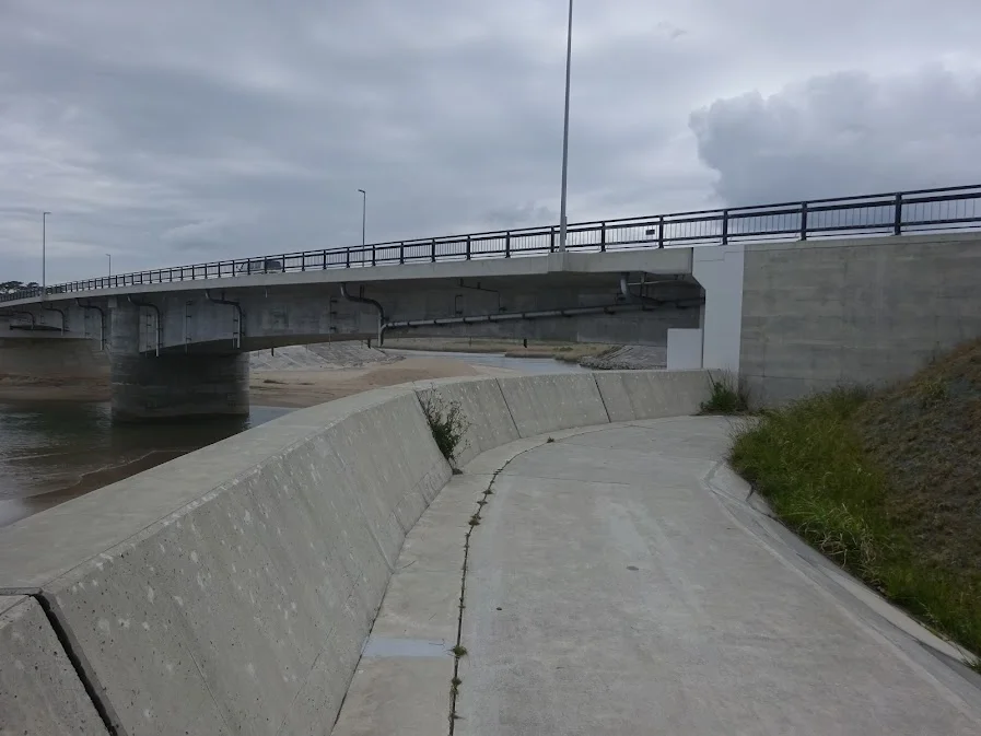 La piste y est toutefois interrompue brusquement par le pont Higashimaiko ( 東舞子橋 ) , qui surplombe l’embouchure de la rivière Niida ( 仁井田川河口 ). De l’autre côté, une piste cyclable dont l’aménagement semble encore inachevé, sur une digue de béton vraisemblablement mise en place après 2011, épouse le lit de la rivière vers l’ouest, donc vers l’intérieur, les collines et les montagnes.