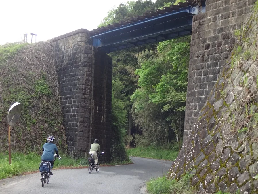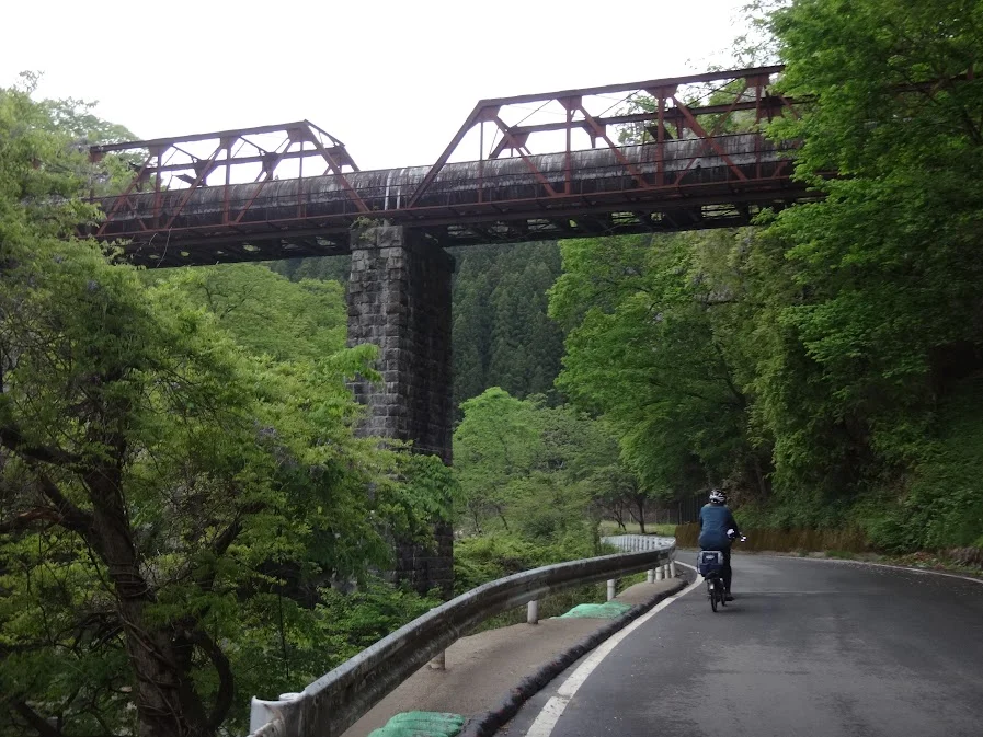En arrivant au hameau de Tanaki (棚木), nous passons cette fois-ci sous la voie ferrée de la ligne Ban’etsutō (磐越東線), dont la charpente métallique se trouve soutenue par de vieux murs de brique à travers lesquels transpire l’histoire ferroviaire de la région (avec un peu d’imagination).