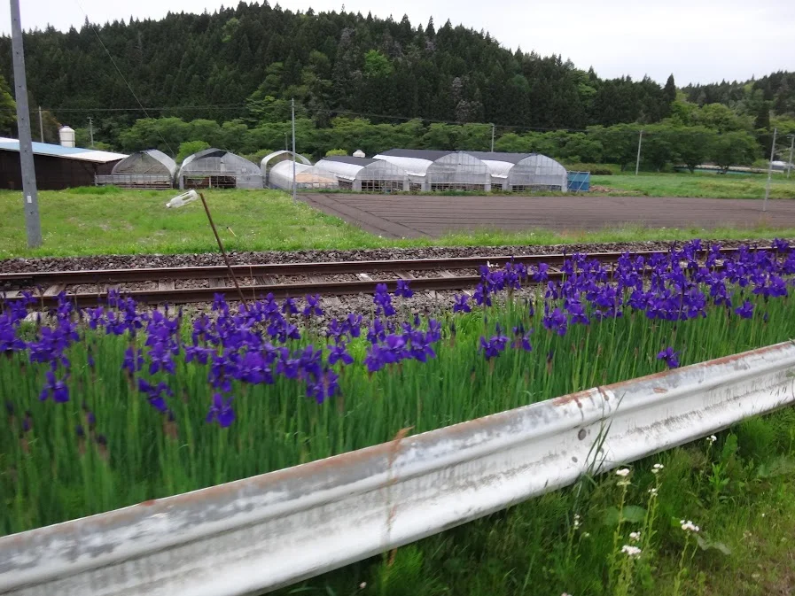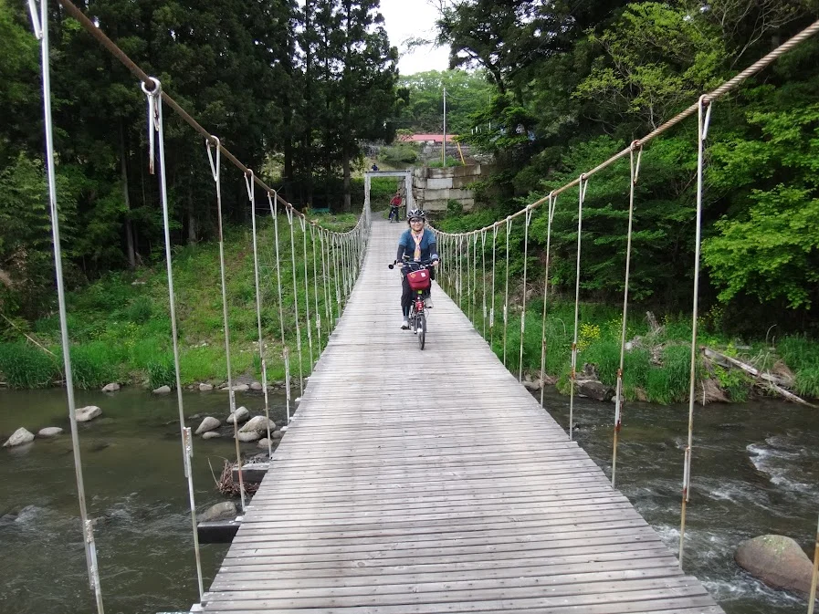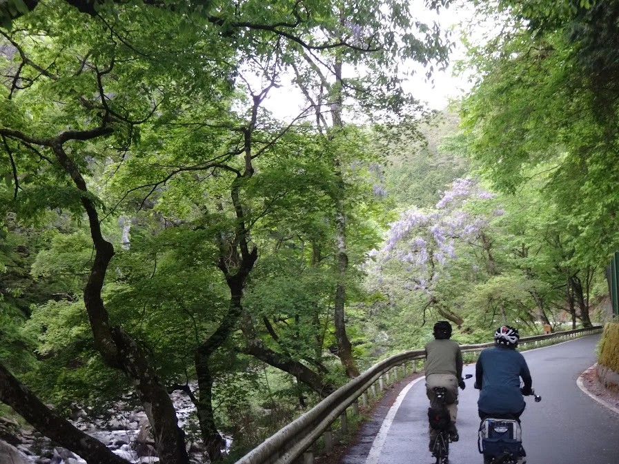 Tandis que Reina lutte encore avec les caprices de connexion de son vélo Soleil rouge, nous apercevons de nombreuses glycines du Japon ( 藤の花 ) dans la forêt. Leur floraison, dans cette préfecture du Tōhoku, a lieu quelques semaines plus tard que dans la région de Tōkyō.