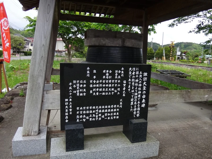 Près de la petite gare de Natsui, nous faisons une pause au sanctuaire Suwa ( 諏訪神社 ) du hameau, devant lequel se trouve un énorme chaudron, appelé Suwa Ōkama (諏訪大釜).