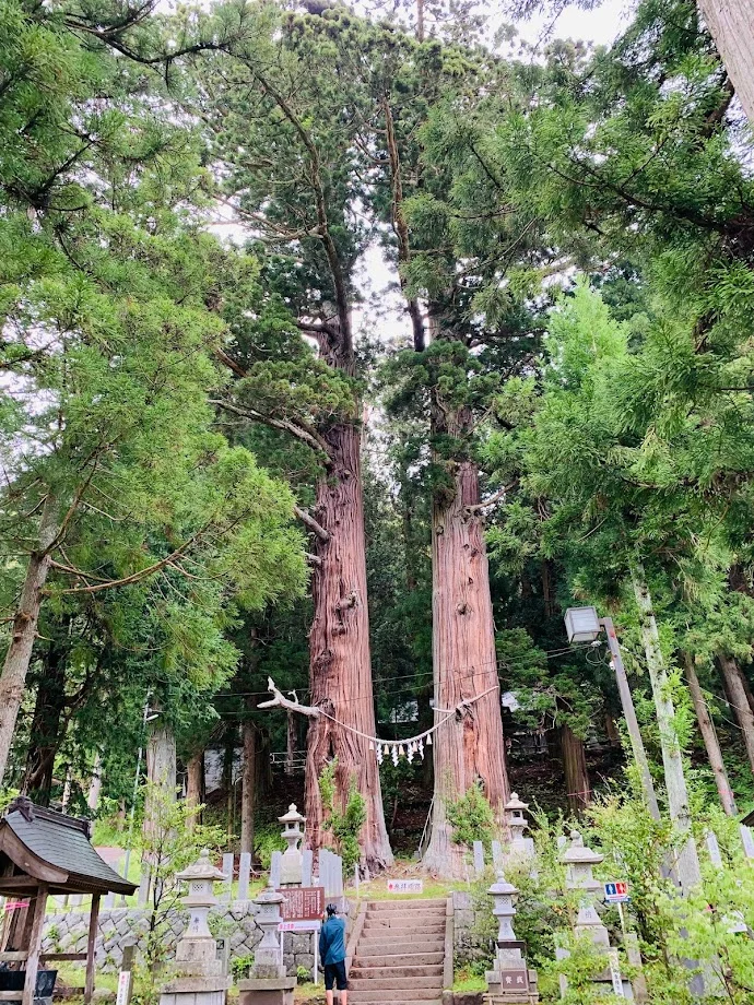Y sont vénérés, avec le respect dû aux manifestations divines, deux arbres âgés de plus 1 200 ans. Ces deux cèdres ou cryptomères du Japon, on les appelle respectivement Jijisugi (翁杉) et Babasugi (媼杉), ce qu’on pourrait s’amuser à traduire par Crypto(pé)père et Crypto(mé)mère. 😀