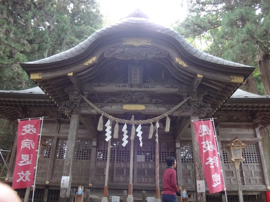 Derrière ce couple millénaire, tout en haut, se trouve le haiden (拝殿), bâtiment consacré au culte. Le sanctuaire fut construit, à l’époque Heian, par Fujiwara no Tsugutada, qui portait le titre de « général mateur de barbares », après qu’il ait éliminé un seigneur de village qui tyrannisait la population et les officiers affectés à l’administration des provinces. Avant d’engager le combat, ce général établit son campement sur les lieux de l’actuel sanctuaire, y répandit du sable blanc de la barrière de Nakoso (mentionnée dans le premier billet de la journée), planta des cèdres et fit le vœux de remporter la victoire. Sa campagne militaire connut un grand succès et, en signe de reconnaissance, il fit construire le sanctuaire où nous nous trouvons actuellement. Bref, la naissance de Crypto(pé)père et *Crypto(mé)mère remonterait à l’époque Heian et ils auraient été les témoins silencieux d’une partie de la conquête du nord par la cour, aux dépens des emishi (蝦夷). Nous roulons littéralement dans l’histoire du Japon et, ne serait-ce que pour cela, ça vaut le déplacement…