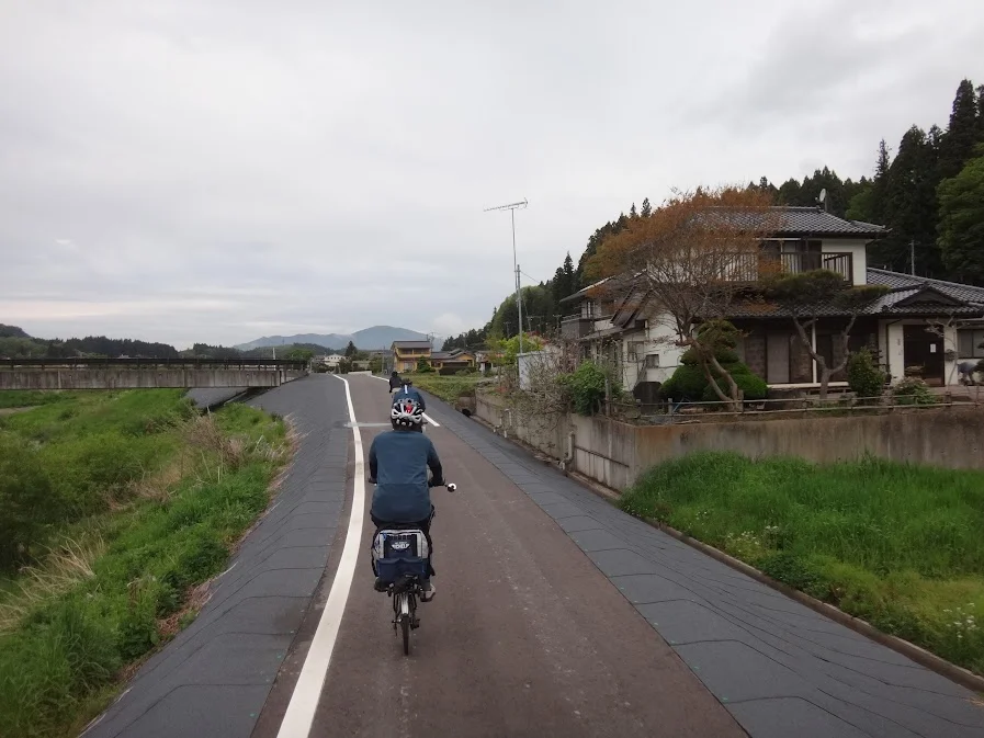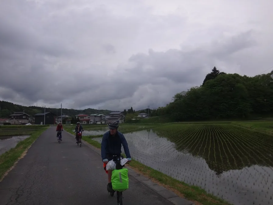 Aux environs de la gare, nous longeons la rivière Ushinatsuigawa (右支夏井川), puis roulons entre les rizières de bas-fonds ( 谷津の田んぼ ).