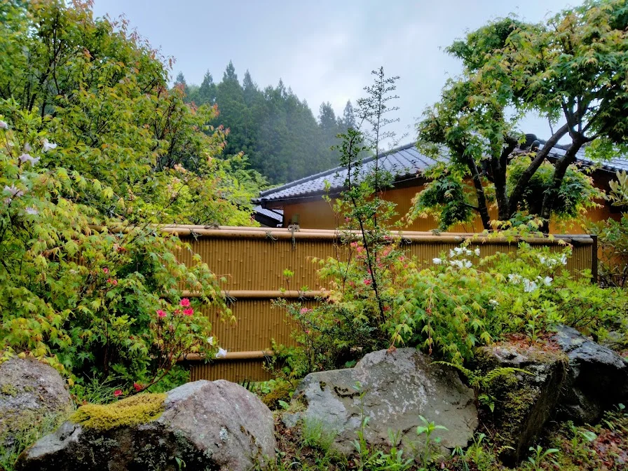 Une partie de la cour de l’auberge et la forêt environnante, vus depuis le bain extérieur ( 露天風呂 )