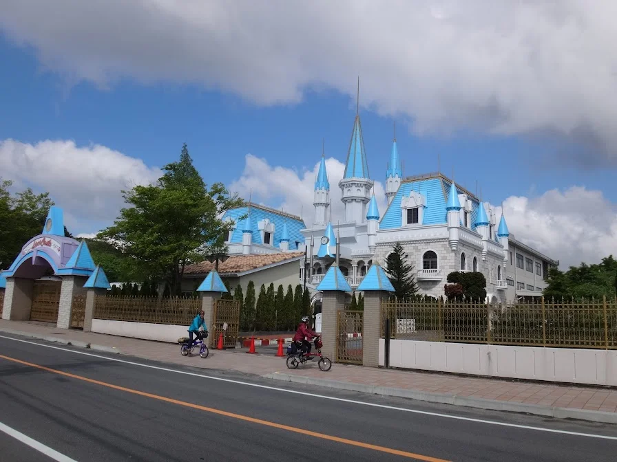 Au bourg, nous sursautons un peu à la vue du château de Licca-chan, cette poupée japonaise qui équivaut ici, en popularité, à la Barbie américaine. Les portes n’étant pas encore ouvertes à cette heure de la matinée, nous passons devant sans trop nous y attarder.