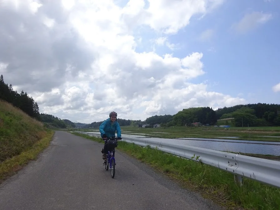 En route vers le temple Manpukuji, Salīna roule, le cœur léger, le long des rizières fraîchement repiquées.