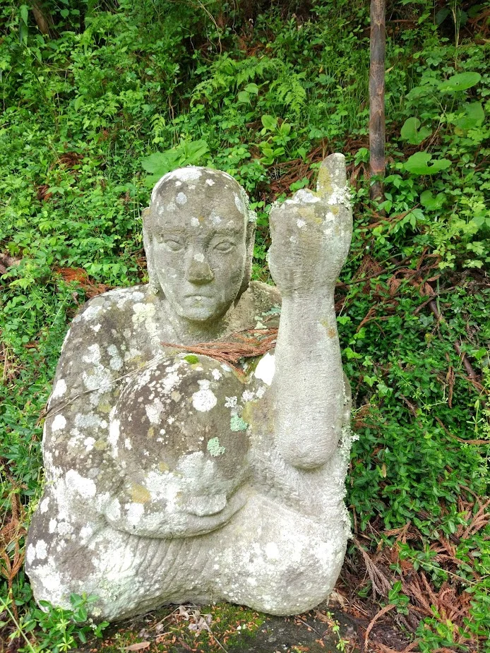 Tout en bas, un premier escalier. Sur sa gauche, la porte « sanmon » (山門) se trouve décalée, observe Sider. Suivent, à droite de ce premier escalier, d’autres escaliers et des petits sentiers qui mènent au sommet, où se trouve un gros Iwafudō ( 岩不動 ), la divinité Acala si je ne m’abuse, gravée dans le roc, et, sous cette divinité, dit l’inscription sur le plan, les « 500 arhats » (mais en fait ils sont dispersés un peu partout dans l’enceinte, pas tous sous l’Iwafudō).