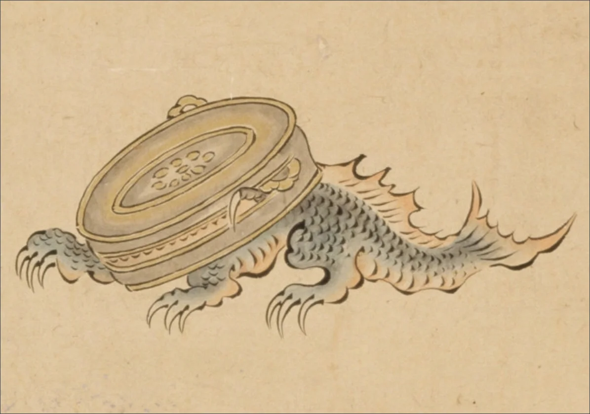 Nous nous approchons quand même et Sider en profite pour demander à mon compagnon bipède s’il connaît l’appellation japonaise du gong en bronze, à l’entrée du bâtiment. Comme toujours, mon compagnon ignare avoue son ignorance, et apprend que ce gong est appelé « waniguchi » (鰐口), la « bouche du wani ». Ledit wani désigne un monstre marin ou dragon de mer de la mythologie japonaise. Vue de dessous, la fente du gong lui donne l’apparence d’une bouche entrouverte…
