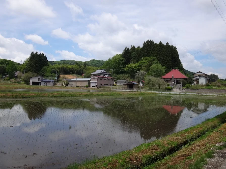 Au cœur du hameau de Yanagihashi (柳橋), bourg de Nakata (中田町), nous roulons sur un étroit chemin qu’accompagne, sur sa gauche, le lit d’un petit canal.