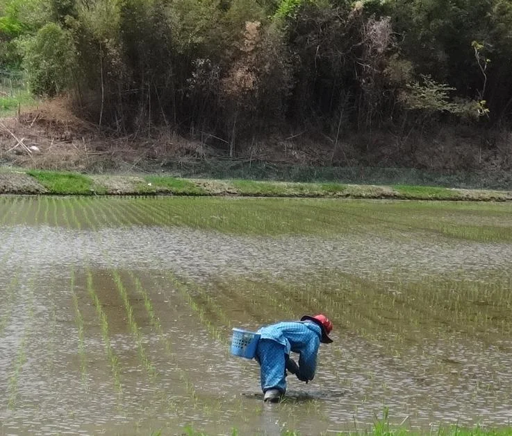 Le repiquage ( 田植え ) se fait à la main dans les très petites rizières, mais dans ce cas-ci, la paysanne, avec son panier de plants ( 苗 ) sur les hanches, achève plutôt le travail incomplet de la machine.
