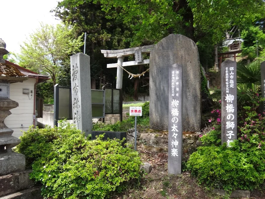 Inscrits au patrimoine culturel immatériel de la ville de Kōriyama, les monuments de pierre verticaux y représentent la danse du lion ( 獅子舞 ) et la danse théâtrale Daidaikagura (太々神楽).