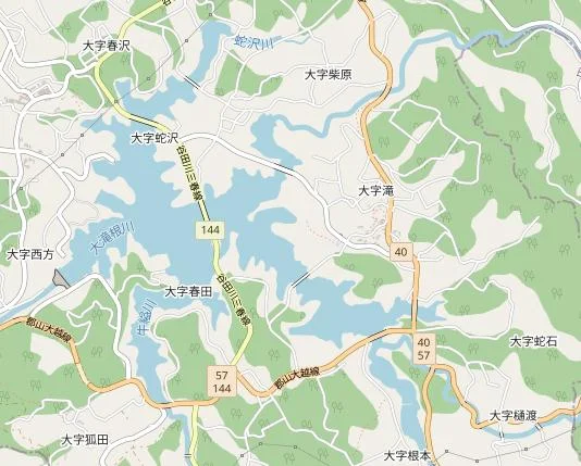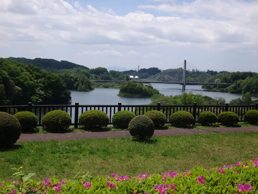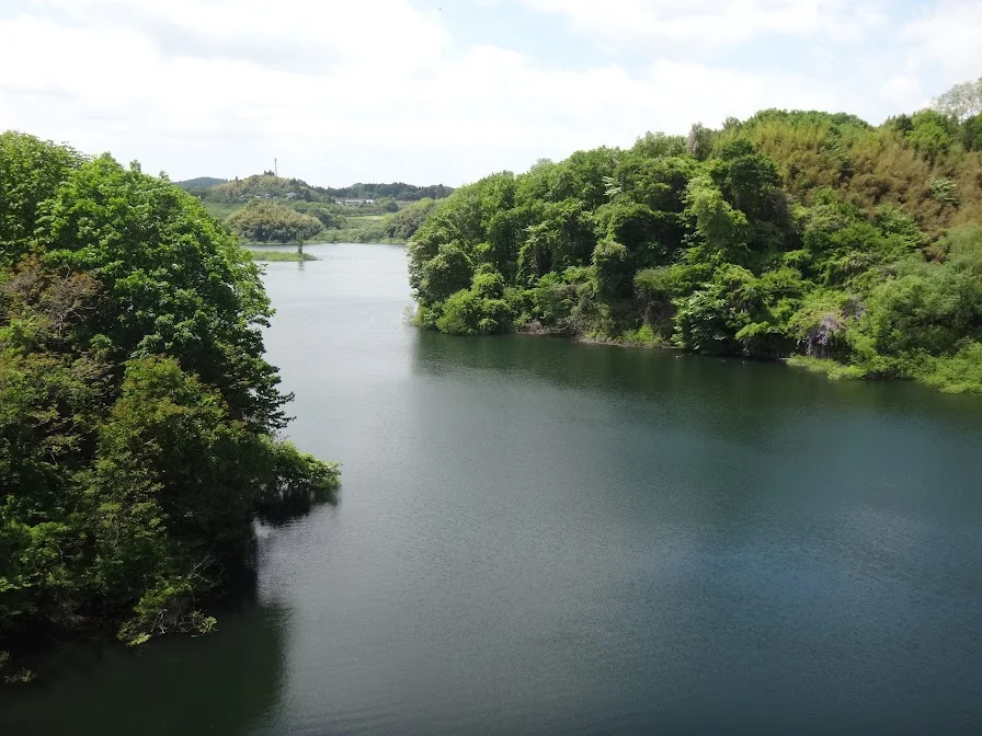 Le lac Sakura vu depuis le pont Nakasato. Ce lac a été engendré par la construction, en aval de la rivière Ōtakinegawa (大滝根川), du barrage de Miharu.