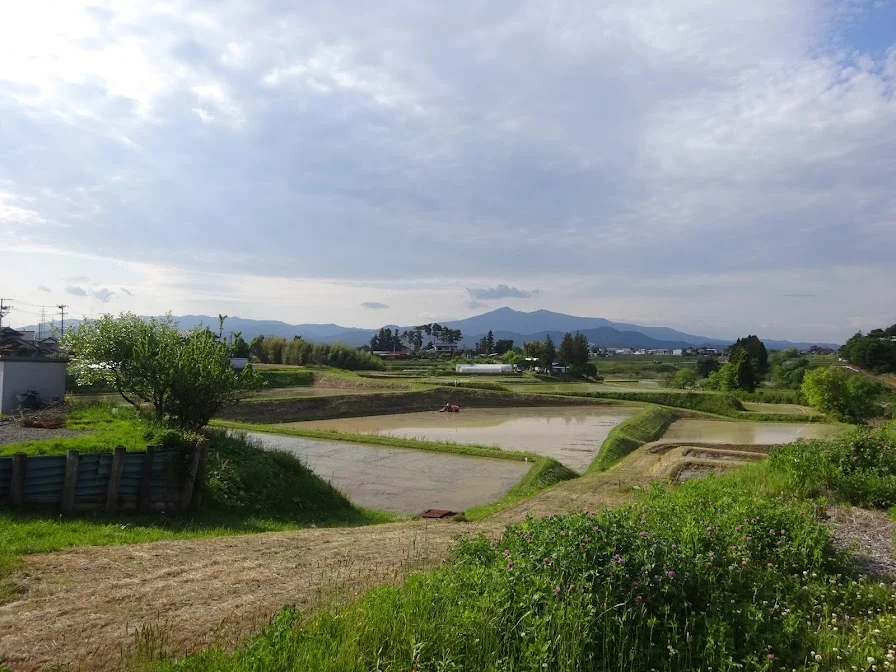 Les monts Adatara et Oshō vus depuis le bourg de Hiwada, où se trouvait la ville-étape du même nom à l’époque du poète Bashō (XVIIe siècle)