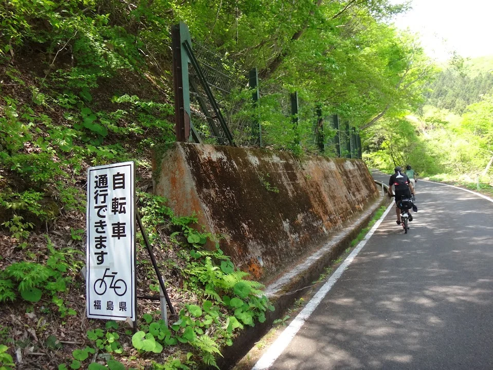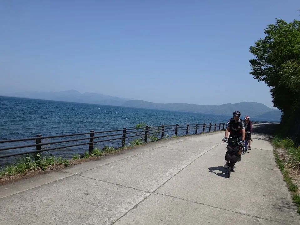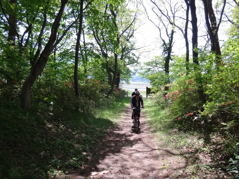 Après une brève pause, nous poursuivons notre petit bonhomme de chemin par la rive sud du lac, et rencontrons, au bas de la petite montée qui nous attend, une affiche énigmatique par laquelle la préfecture nous informe que les vélos sont autorisés à circuler ( 自転車 通行 できます) sur cette route.