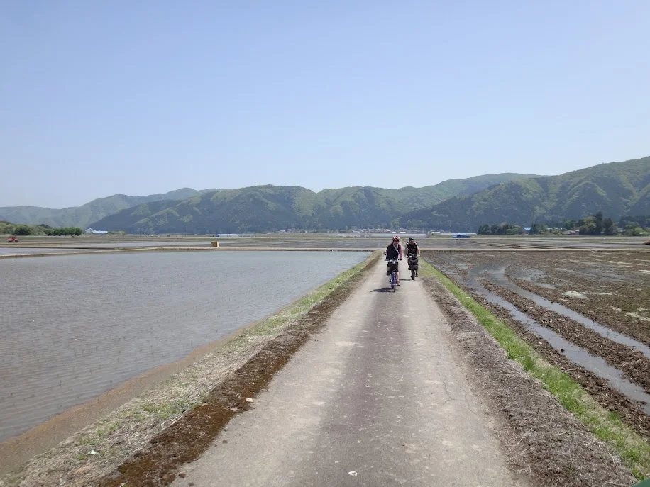 Après la pause sur la plage déserte, nous nous en écartons pour rouler à travers des rizières qui, à cette hauteur (environ 500 mètres), ne sont pas encore toutes repiquées.