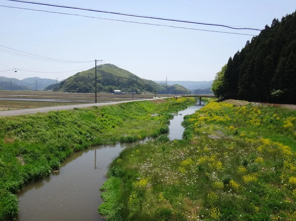 Après le hameau d’Akiyama, nous croisons trois rivières. La troisième est la Tokonatsugawa (常夏川), dont les caractères chinois disent que c’est toujours l’été (常夏), tandis que les fleurs de moutarde chinoise, remarque Sider, nous signalent la présence du printemps !