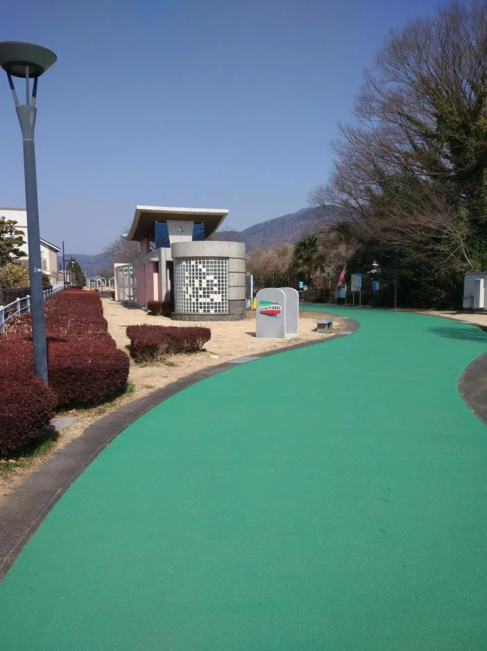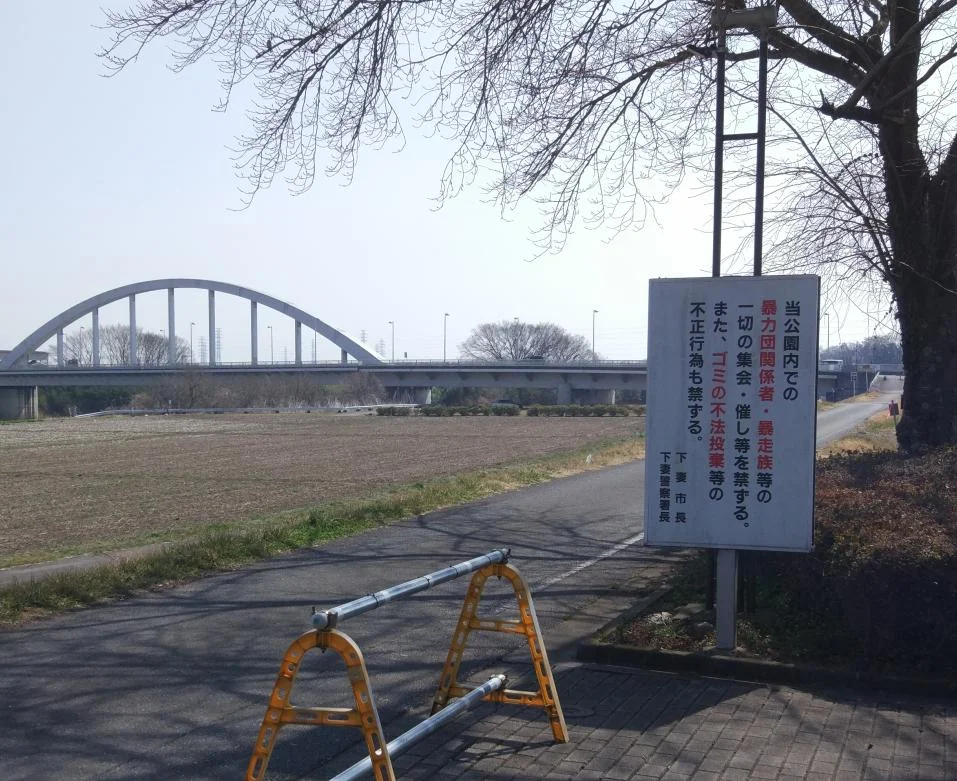 À cet endroit, le cycliste à la vessie pleine peut d’abord se rendre de l’autre côté du pont pour accéder aux toilettes publiques d’un parc floral. Devant ces toilettes, une affiche interdisait explicitement les rassemblements des membres du crime organisé (暴力団) et des bōsōzoku.