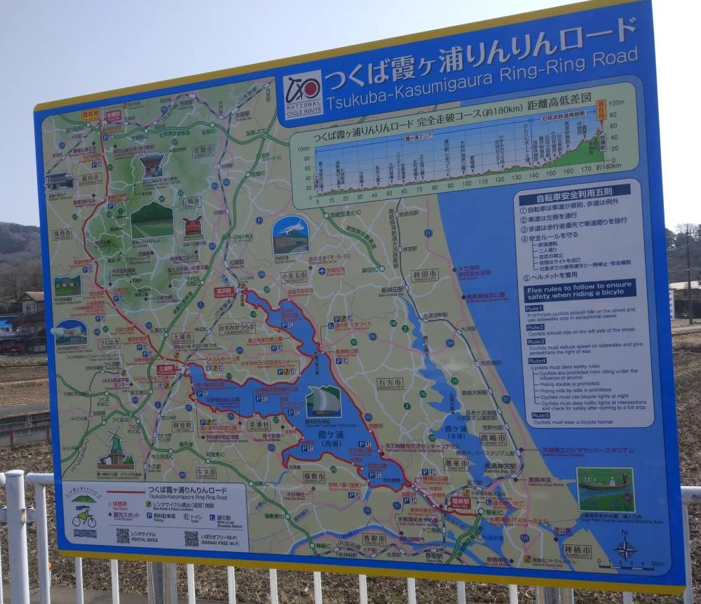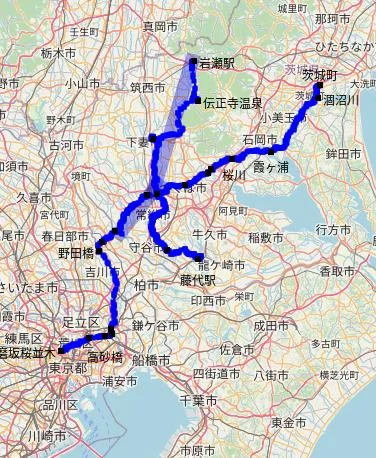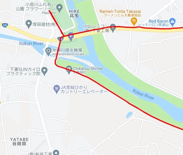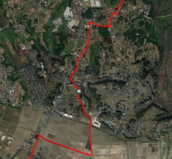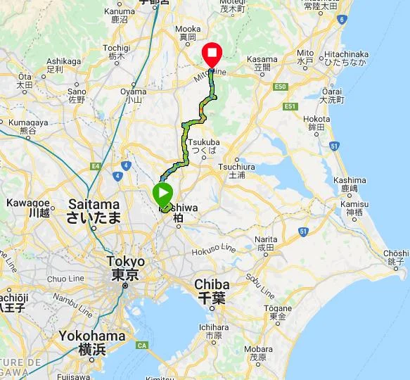 Le trajet GPS longeait la rivière Kokaigawa jusqu’à la ville de Shimotsuma (下妻市), puis la quittait à la hauteur du pont Iwa (岩橋) pour prendre la direction du mont Tsukuba (筑波山).