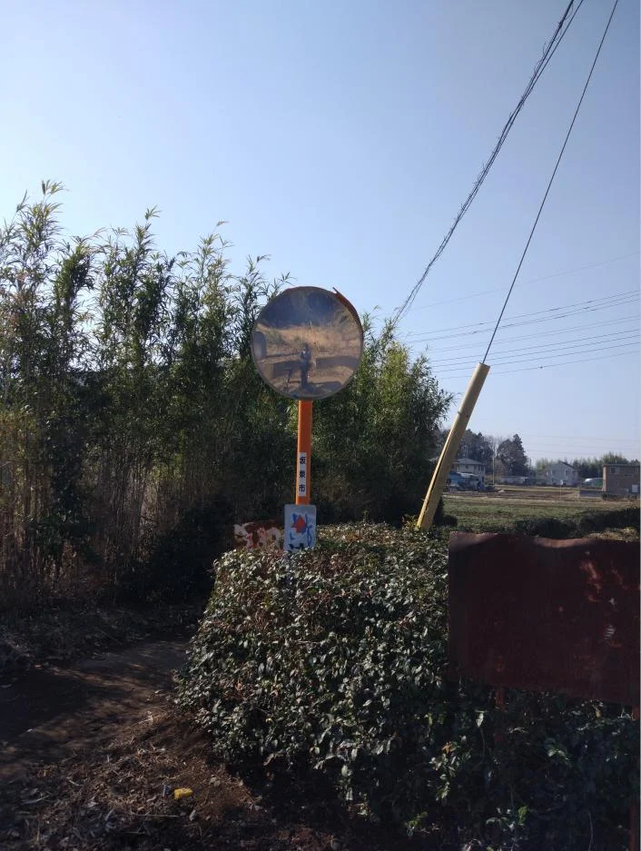 Ce qu’on rencontre aussi un peu partout, ce sont les miroirs de courbe (カーブミラー) le long des routes, pour la prévention des accidents. Celui-ci était un peu sale, mais j’en ai profité pour nous prendre en photo.