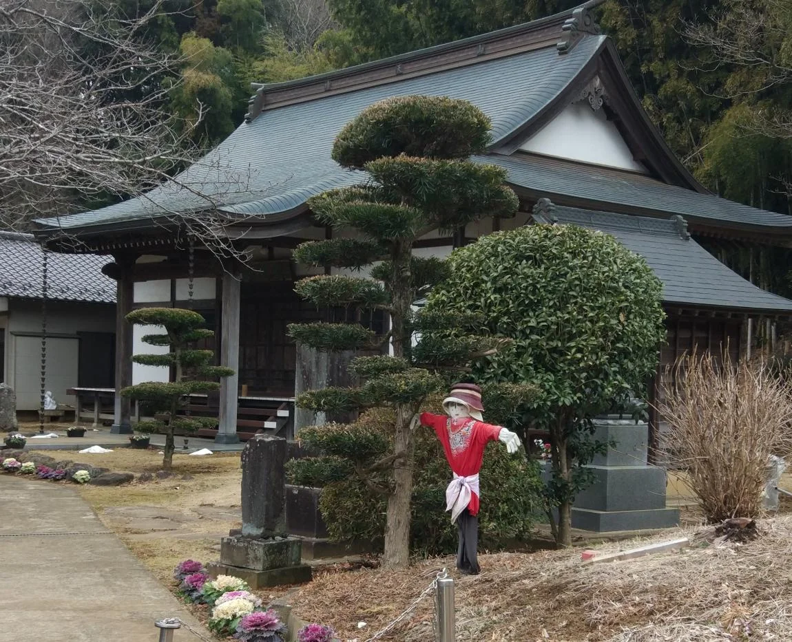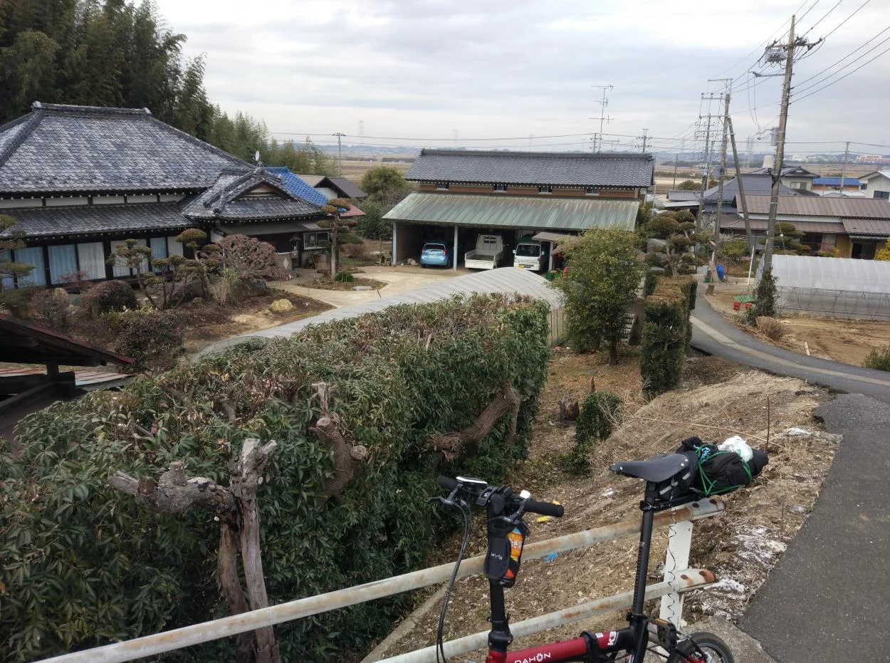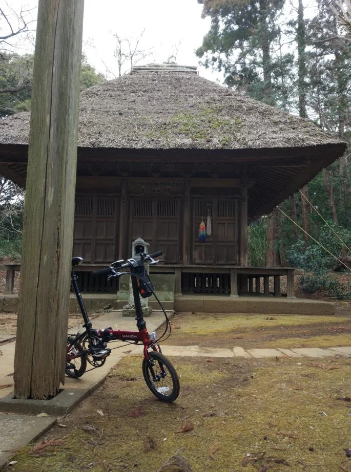 C’est le genre de parcours qui nous attire en ces lieux, bien davantage que la confortable monotonie des pistes cyclables. On y rencontre des sanctuaires et des temples, beaucoup de sanctuaires et de temples (tellement que le lecteur se lasserait vite si je mettais toutes les photos ici) et, parfois, des résidents qui vaquent à leurs occupations rurales, comme cette dame qui s’affaire dans sa cour adjacente au temple, près d’un petit feu de branches et d’herbes.