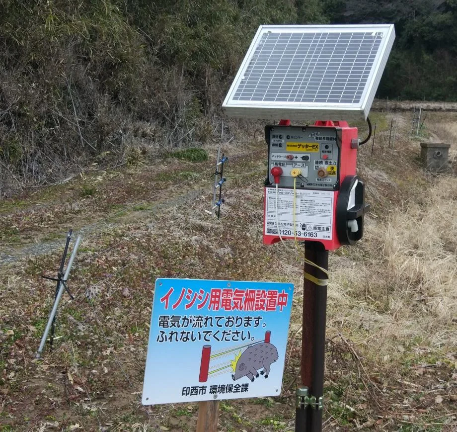 Dans toute cette région, entre les marais Inbanuma et Teganuma, les champs sont entourés de basses clôtures électriques alimentées par de petits panneaux solaires. Ce sont, dit l’affiche, des clôtures électriques pour sangliers, à ne pas toucher.