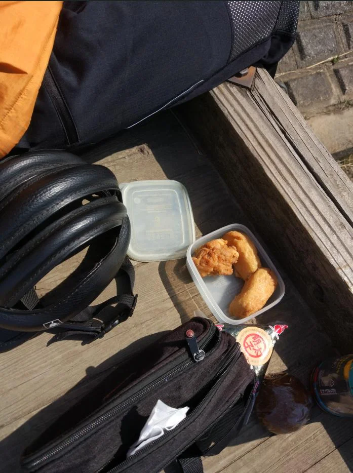 J’aime, sur les ponts de bois, regarder mon repas de poulet frit et d’inarizushi tout en mâchant mon premier morceau de poulet. J’aime aussi garder le mentaiko o-nigiri (明太子おにぎり) pour la fin, et laisser dépasser le mouchoir de mon sac pour m’essuyer les doigts entre deux morceaux de poulet frit. Je n’aime pas, sur l’écran de mon téléphone, les traces de doigt gras.