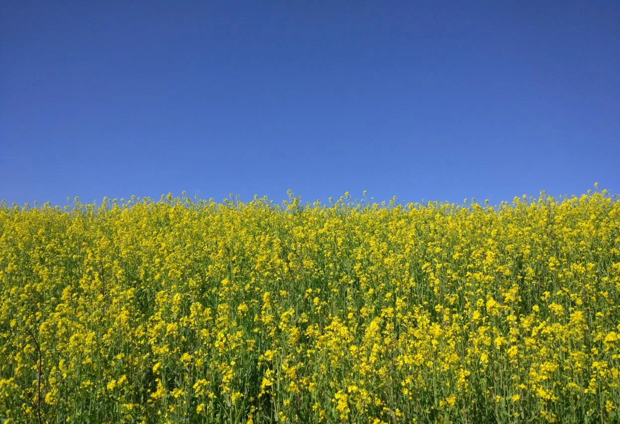 Des deux côtés de la piste, encore des fleurs de moutarde chinoise, à perte de vue.