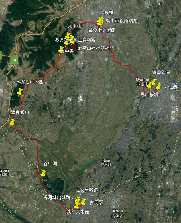La carte ci-dessus montre le trajet d’environ 56 km que nous avions prévu pour ce samedi 5 février 2022. Concrètement, ça donnait une heure et demie de train pour arriver vers 9 h 00 du matin à la Gare Oyama de JR, puis le parcours GPS nous mènerait contre le vent à travers champs hivernaux et rizières gelées jusqu’au pied du mont Ōhira (大平山), suivi d’une montée athlétique et d’une redescente rapide, puis d’une agréable balade rurale jusqu’à la rivière Watarasegawa (渡良瀬川), après quoi nous n’aurions plus qu’à nous laisser glisser, vent dans le dos, jusqu’à la gare de Koga.