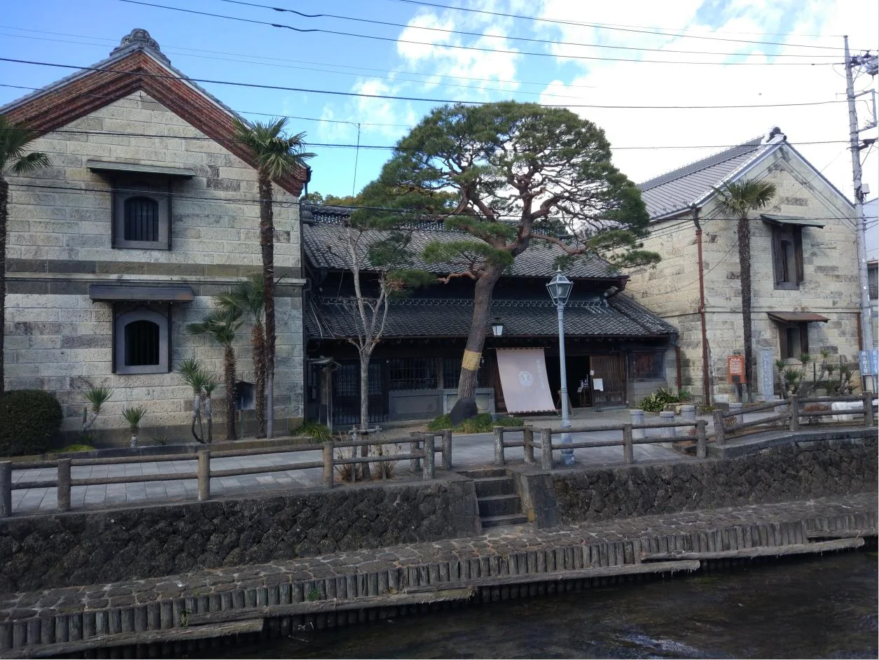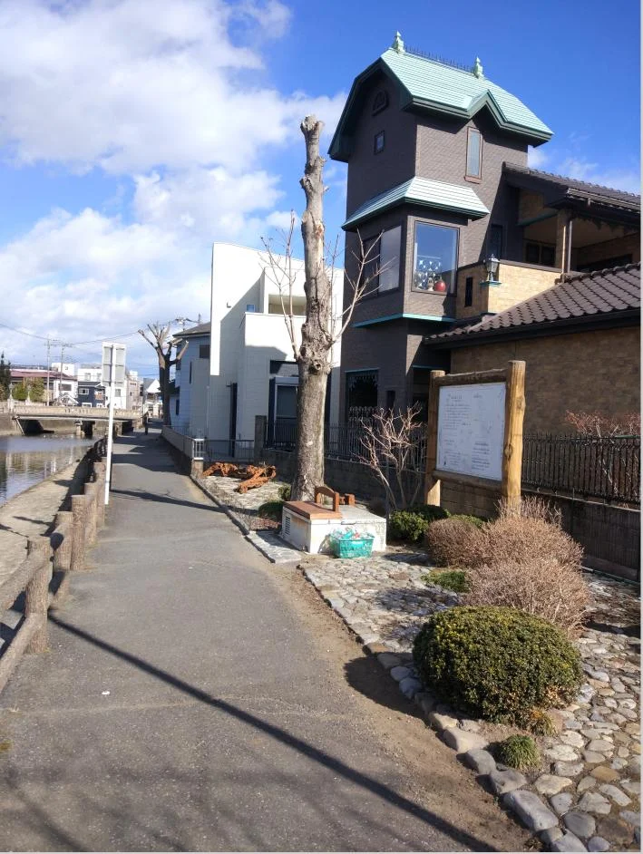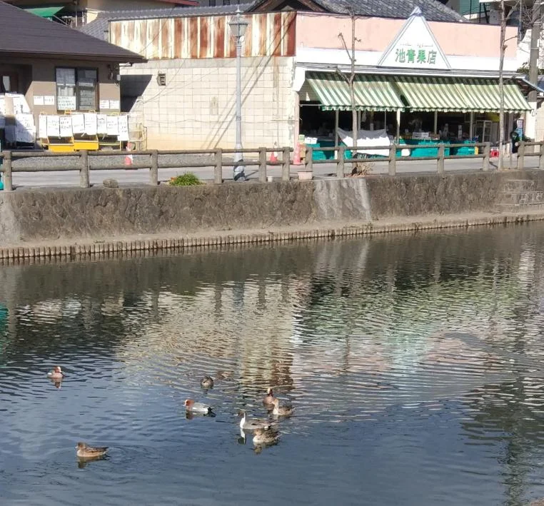 Un peu plus loin, des canards passent cette journée d’hiver sur la rivière Usumagawa (巴波川), avec pour toile de fond ironique le caractère de l’étang (池) sur l’enseigne du Marché de fruits et légumes « Ike ».