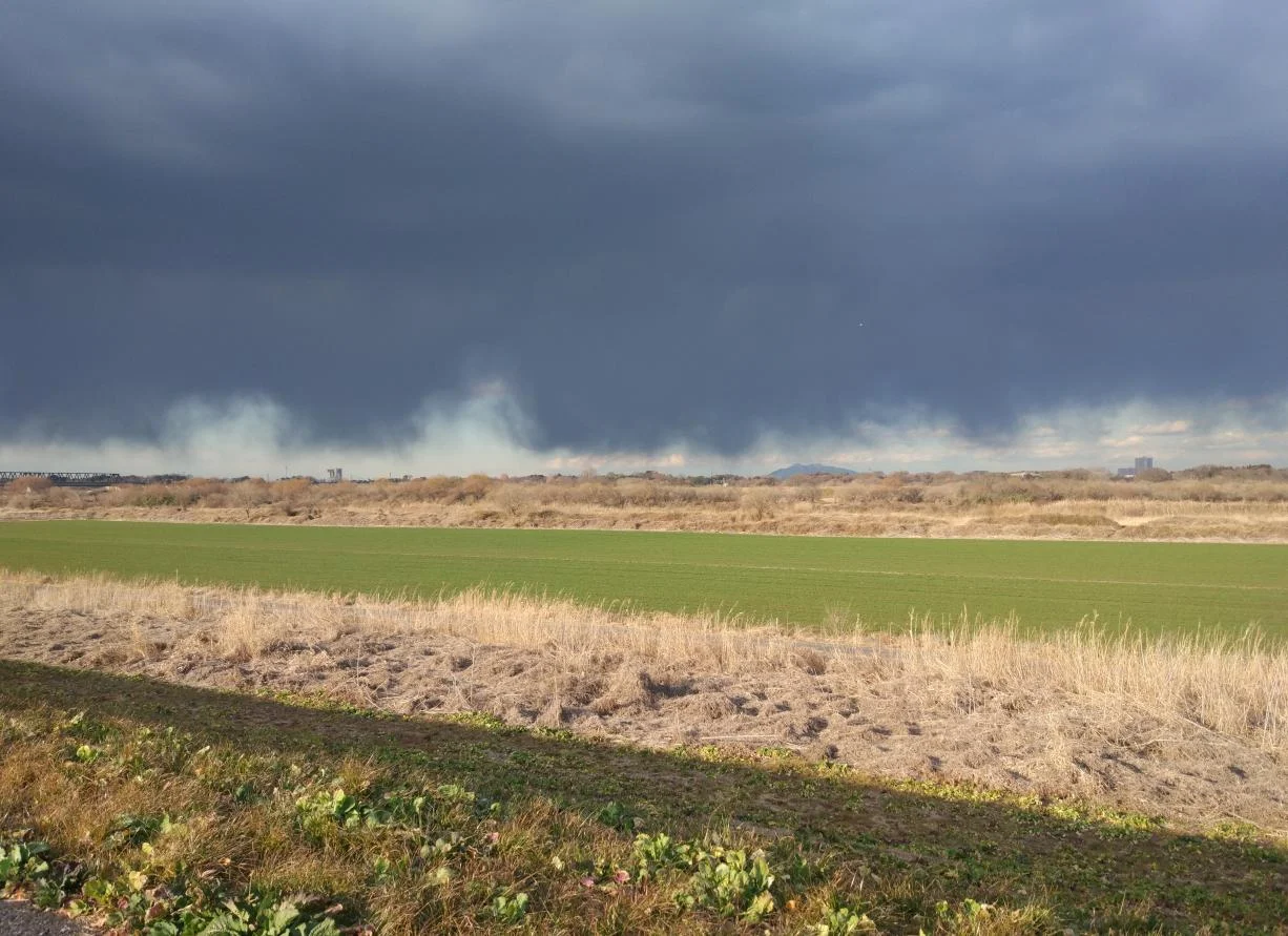Quelques 15 ou 20 minutes plus tard, alors que nous étions revenus sur la rive ouest du fleuve Tonegawa et roulions vers la maison, ce fut au tour des nuages de bousculer notre rythme respiratoire. En effet, juste au-dessus de la rive est, là où nous avions roulé deux jours plus tôt du côté de Bandō, d’affreux nimbus pesaient de tout leur poids sur la piste cyclable, tandis que le soleil déclinant nous aveuglait de notre côté du fleuve.