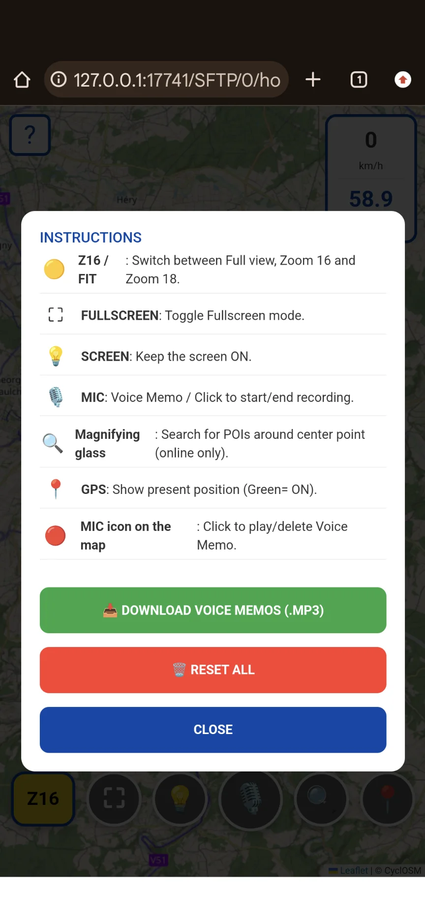 With the yellow icon in the bottom left corner, you can choose your zoom level. Each press toggles the zoom between the route overview, the downloaded tiles zoom (16x), and an 18x zoom, which is a browser-level zoom (the image blurs slightly but remains clearly visible). For navigating open countryside, zoom 16 is perfect for a general idea of what’s coming, while zoom 18 helps avoid mistakes at intersections—very practical in the city.